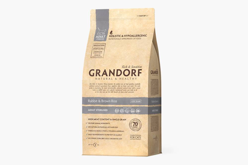 Представляет собой обширное мясное меню. Бельгийский производитель влажных кормов Grandorf предлагает 12 вариантов мясного и рыбного меню. Состав прозрачен, как ни в одном из кормов: 75 % мяса и 25 % собственного сока.