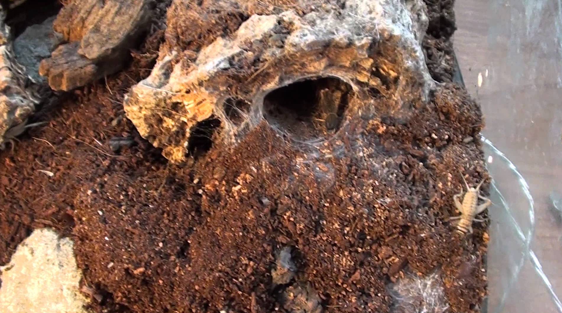 Стоит обратить внимание и на обустройство внутреннего пространства резервуара. Если вы собираетесь приобрести наземных обитателей, селящихся в норах, придётся насыпать в террариум 15-сантиметровый слой почвы, что обеспечит пауку условия, максимально приближённые к естественным