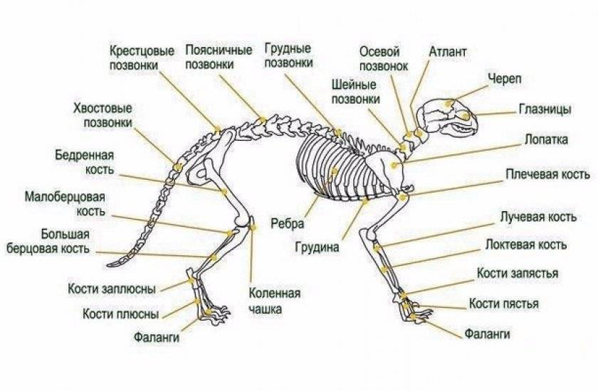 Скелет кошки подобен скелету собаки и других млекопитающих: крепкий мощный череп, хребет, который плавно уходит позвонками в хвост, устойчивые кости лап. Хотя толщина, длина и количество костей или позвонков могут немного отличаться в зависимости от породы, основной костяной каркас идеален в каждой мелочи.