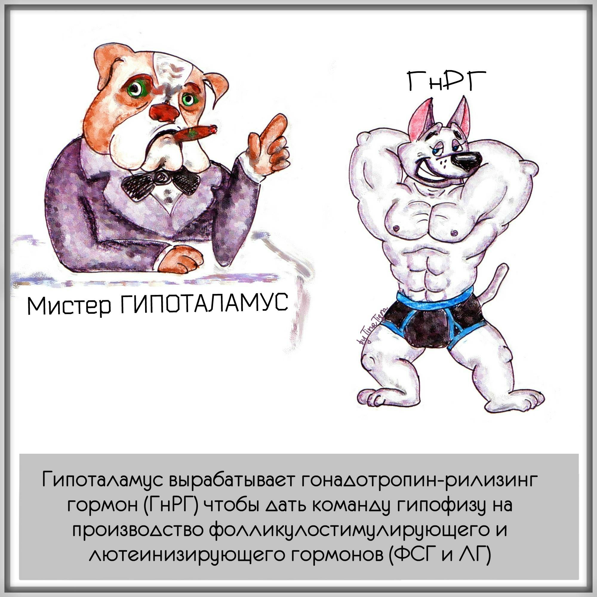 Всеми гормонами в организме управляет гипофиз, железа в головном мозге. А гипофиз в свою очередь подчиняется гипоталамусу. Именно гипоталамус вырабатывает гонадотропин-рилизинг гормон (ГнРГ). ГнРГ дает команду гипофизу на производство фолликулостимулирующего и лютеинизирующего гормонов (ФСГ и ЛГ). И уже они влияют на половые железы.