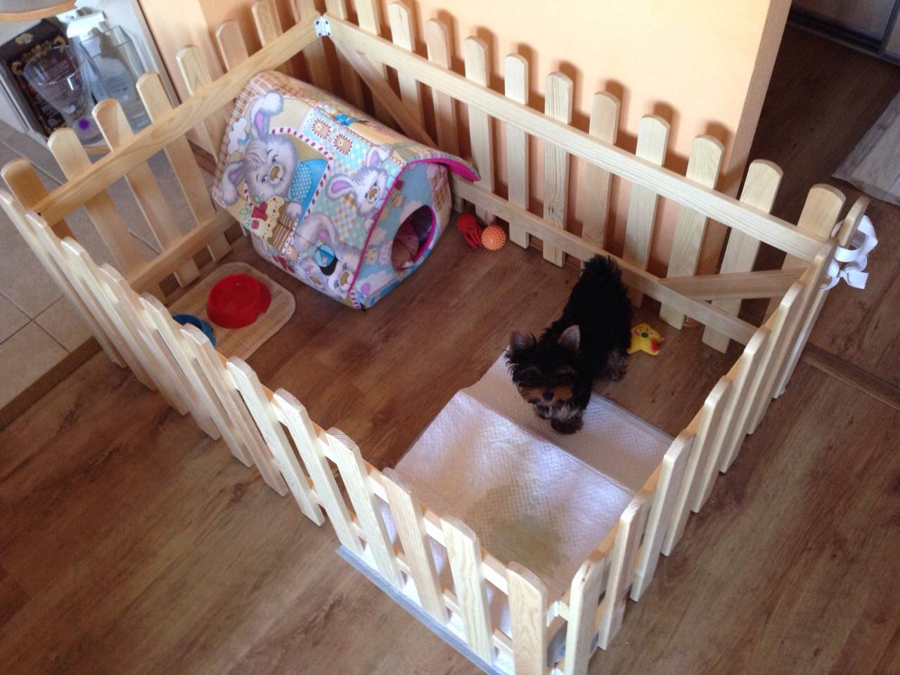 Щенка надо приучить к туалету. Такой своеобразный «загончик» отлично подойдет для ограничения пространства собаке. Поэтому только на этой территории она найдет себе укромное место, чтобы справлять нужду, а хозяин сможет поставить туда лоток или положить пеленку. Как результат, отпадет необходимость искать по всей квартире «сюрпризы» и убирать их.