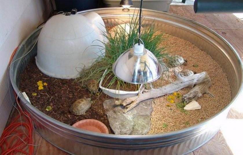 Нет необходимости добиваться одинаковой температуры во всём загоне. Тёплая зона и более прохладный участок местности черепашке понравятся: в более тёплом месте рептилия будет греться, кушать, пить воду, купаться, а в прохладной зоне можно поставить домик для отдыха. Эту роль сыграет небольшой деревянный ящичек с выпиленным входным отверстием. Но и там не стоит опускать температуру ниже +24 градусов во избежание простудных заболеваний.
