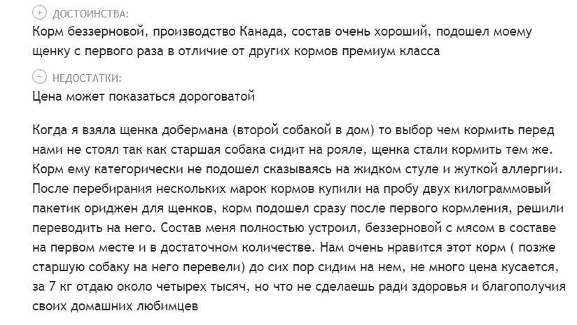 Достоинствакорма понятны – качественные ингредиенты, свежее мясо, отсутствие консервантов и некачественных углеводов. Недостатки– подходит только для активных животных, не рекомендован аллергикам, низкое содержание клетчатки и высокая стоимость.