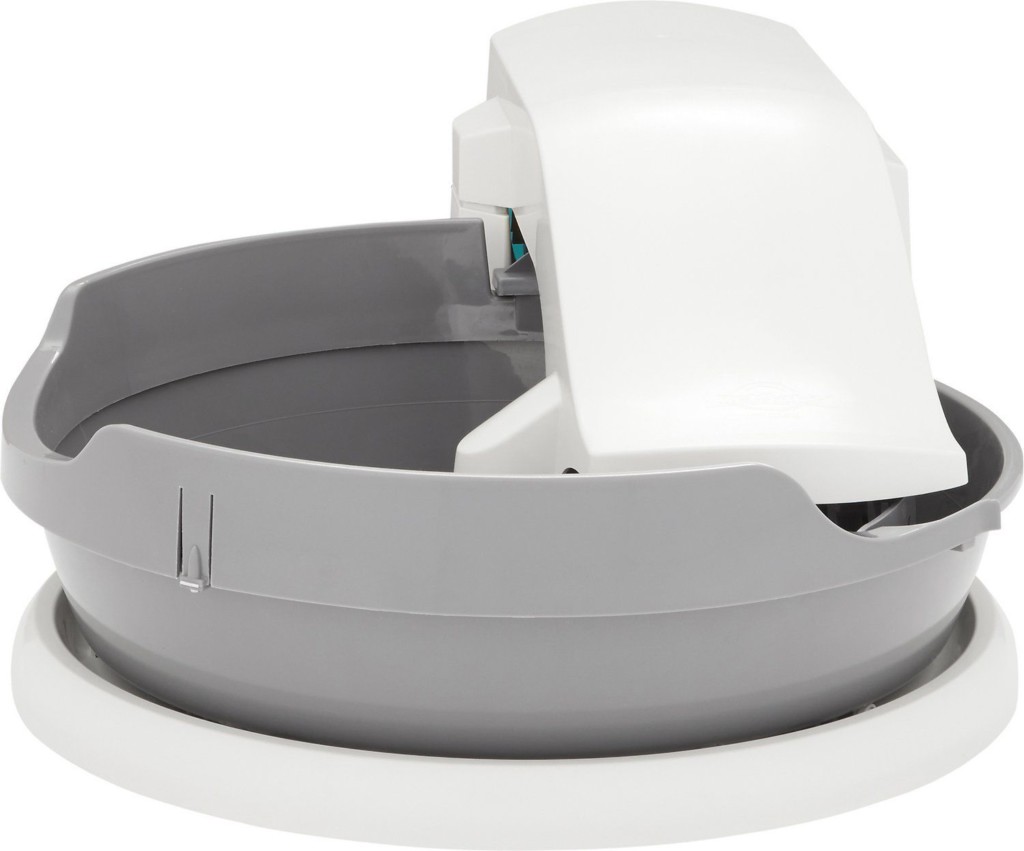 Этот автоматический кошачий туалет представляет собой круглый лоток с гранулами. Принцип его действия следующий: гаджет наполнен гранулами. После того как кошка сделала свои дела, из специального места выезжает совок с грабельками. Совок плотно прижат к стенке лотка, во время движения вращается, наполнитель проходит сквозь грабли. Твердые отходы уезжают вместе с совком и уплывают в канализацию. Жидкие отходы стекают в специальный резервуар и из него уходят в канализацию.