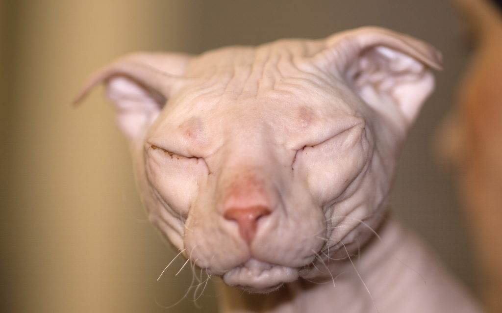 - Шерсти у них почти нет, однако все тело покрыто нежным пушком. В области шеи, глаз, ушей, а также в подмышках имеются небольшие складочки, которые делают эту породу котов индивидуальной.