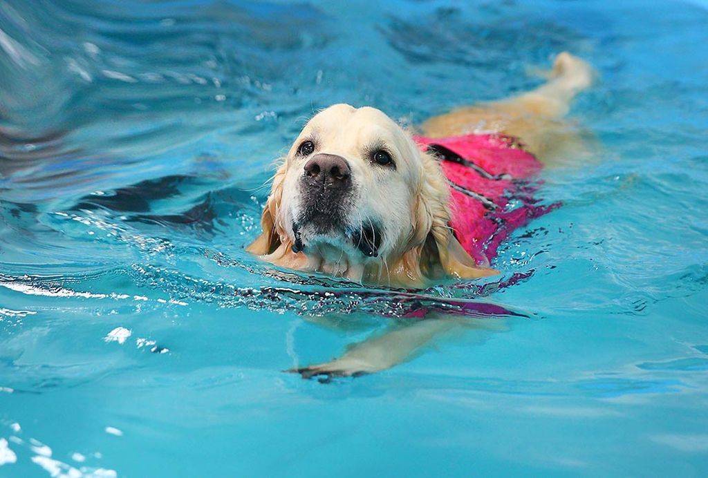 . Гидротерапия является уникальным и комплексным упражнением для всего тела собаки, в том числе и для укрепления мышц спины. Тренировать в воде животное можно с помощью закидывания любимых игрушек. Пес с удовольствием будет плыть и приносить их обратно.