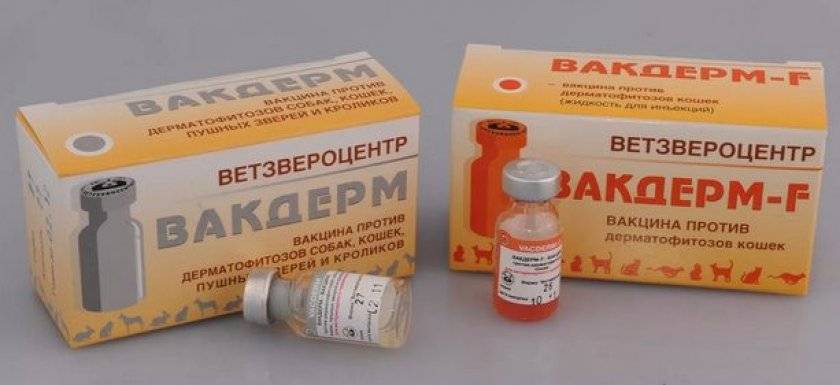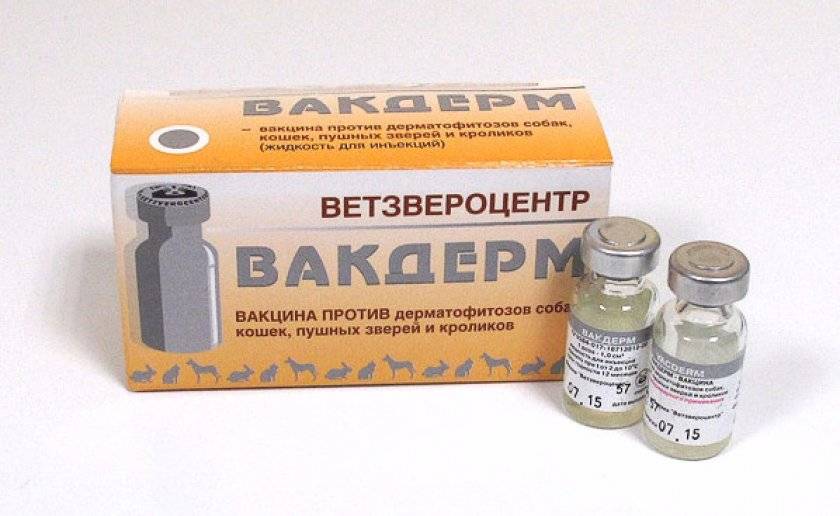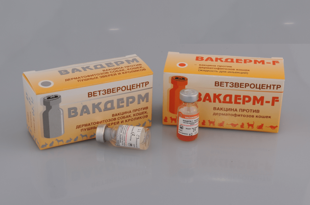 В состав вакцины от лишая для собак, кошек, кроликов «Вакдерм» входят споры грибков трех видов: Microsporum canis, Trichophyton mentagrophytes и Microsporum gypseum. Лекарственная форма препарата выпускается в сухом и жидком виде.