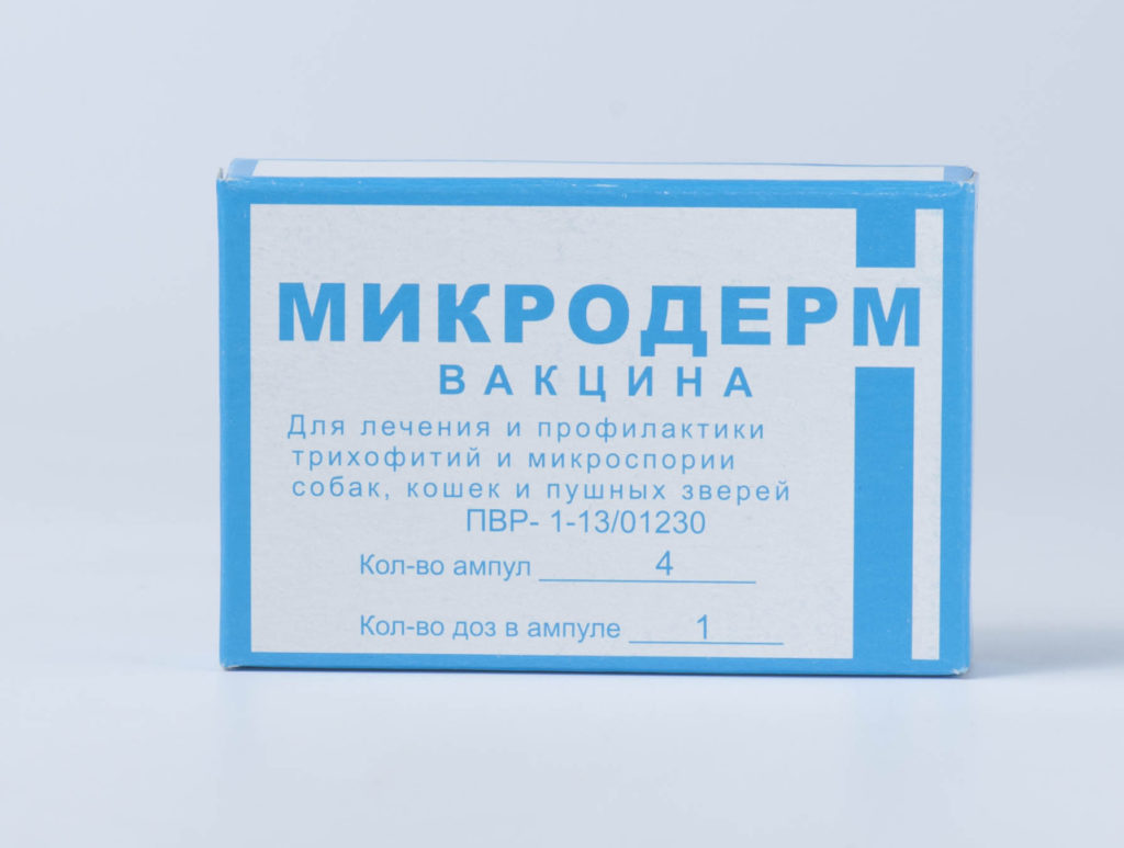 | Микродерм | ООО «Аптека-Сервис» | Пористая масса для приготовления раствора для инъекционного введения | Инактивированные штаммы дерматофитов микроспорум и трихофитон | Животным в 1,5–6-месячном возрасте – 0,3–0,5 мл раствора в профилактических целях, 0,5–1 мл для лечения; питомцам старше полугода – 1–2 мл лекарства в зависимости от массы тела. | Ежегодно дважды с 1,5–2-недельными интервалами |