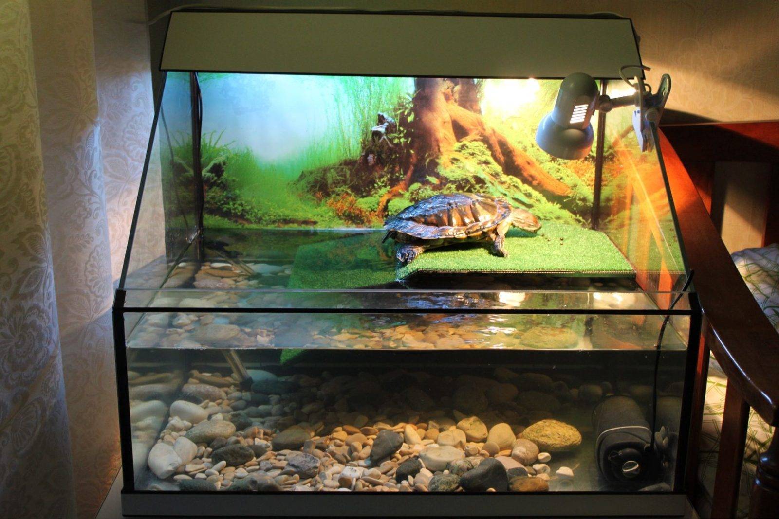 Идеальным местом для содержания красноухих и других водных черепашек является акватеррариум. По сути это аквариум с выступающим над водой островком «суши».