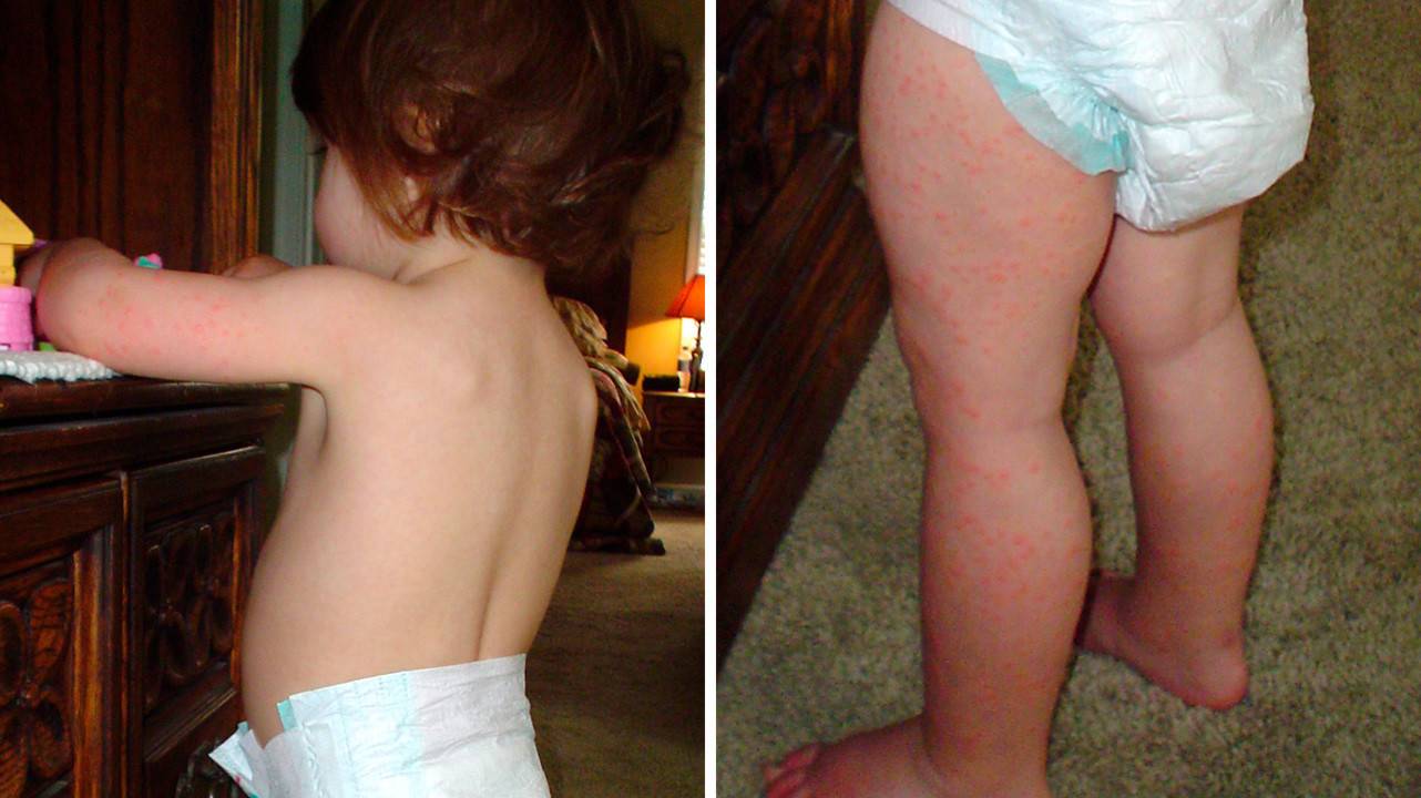 Герпес 6-го типа у детей вызывает детскую розеолу – розовые пятнисто-папулезные высыпания. В основном, ему подвержены малыши в возрасте до 2 лет.Сначала развивается лихорадка, затем температура снижается в течение 3-6 дней. После снижения температуры на коже появляется экзантема — розовые пятнисто-папулезные высыпания 1-3 мм, бледнеющие при надавливании (это один из отличительных признаках, при той же краснухе после надавливания сыпь не бледнеет). Они могут исчезнуть уже через несколько часов, а могут сохраняться до нескольких дней. Сыпь локализуется преимущественно на корпусе, распространяясь на шею, лицо и конечности