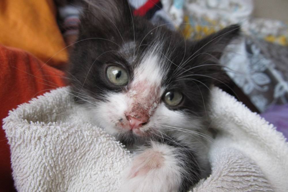 По истечении инкубационного периода, у зараженной кошки появляются первые симптомы болезни. Герпес у кошки на губе или носу выражается в появлении маленьких белых пузырьков, что является самым первым признаком болезни.