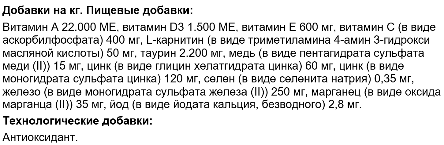 В списке минеральных и витаминных добавок мы нашли две неточности. На русском языке в качестве источника марганца указано неверное вещество — «Марганец (в виде оксида марганца (II))». На этикетке он обозначен как Manganese (as manganese-(II)-sulphate, monohydrate), то есть источником марганца служит сульфат марганца (II), моногидрат. Название источника витамина C здесь должно быть более точным — «Витамин C (аскорбил монофосфат кальция, соли натрия)». Мы исправили эти данные в карточке корма.
