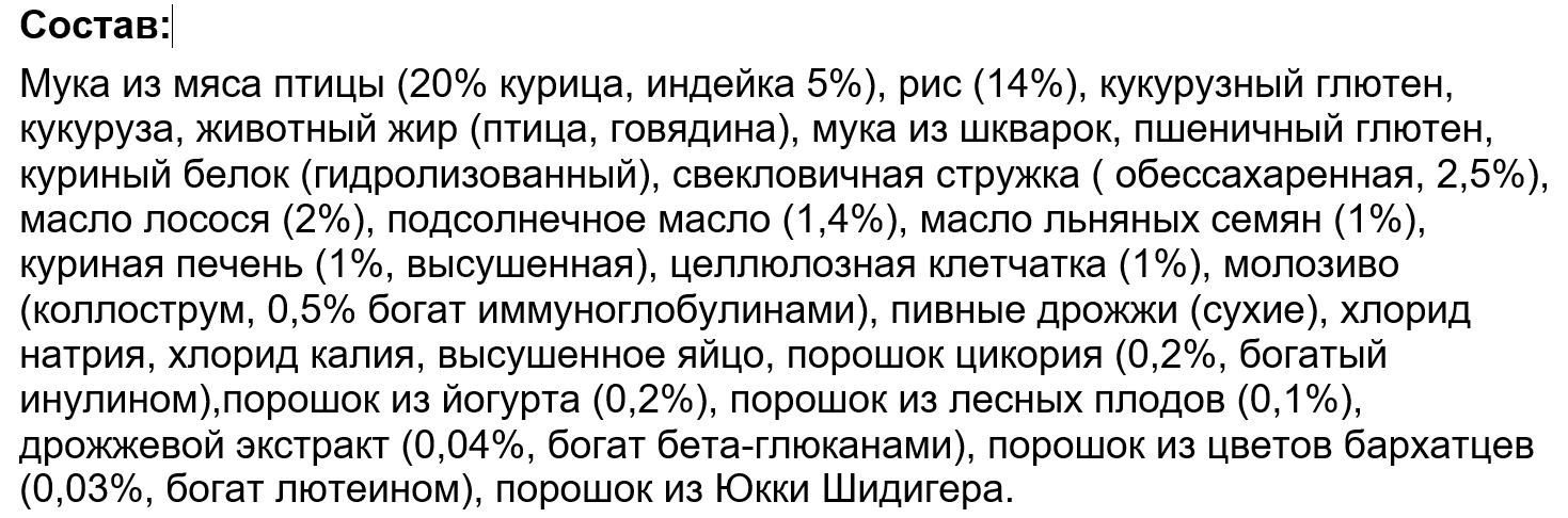 Мы не придаём большого значения мизерным добавкам типа 0,2% порошка из йогурта или 0,1% порошка из лесных ягод — их слишком мало для того, чтобы оказать какое-то полезное воздействие на организм кошек. Почитать подробности об остальных добавках в этом продукте вы можете, нажав на название каждого отдельного ингредиента.